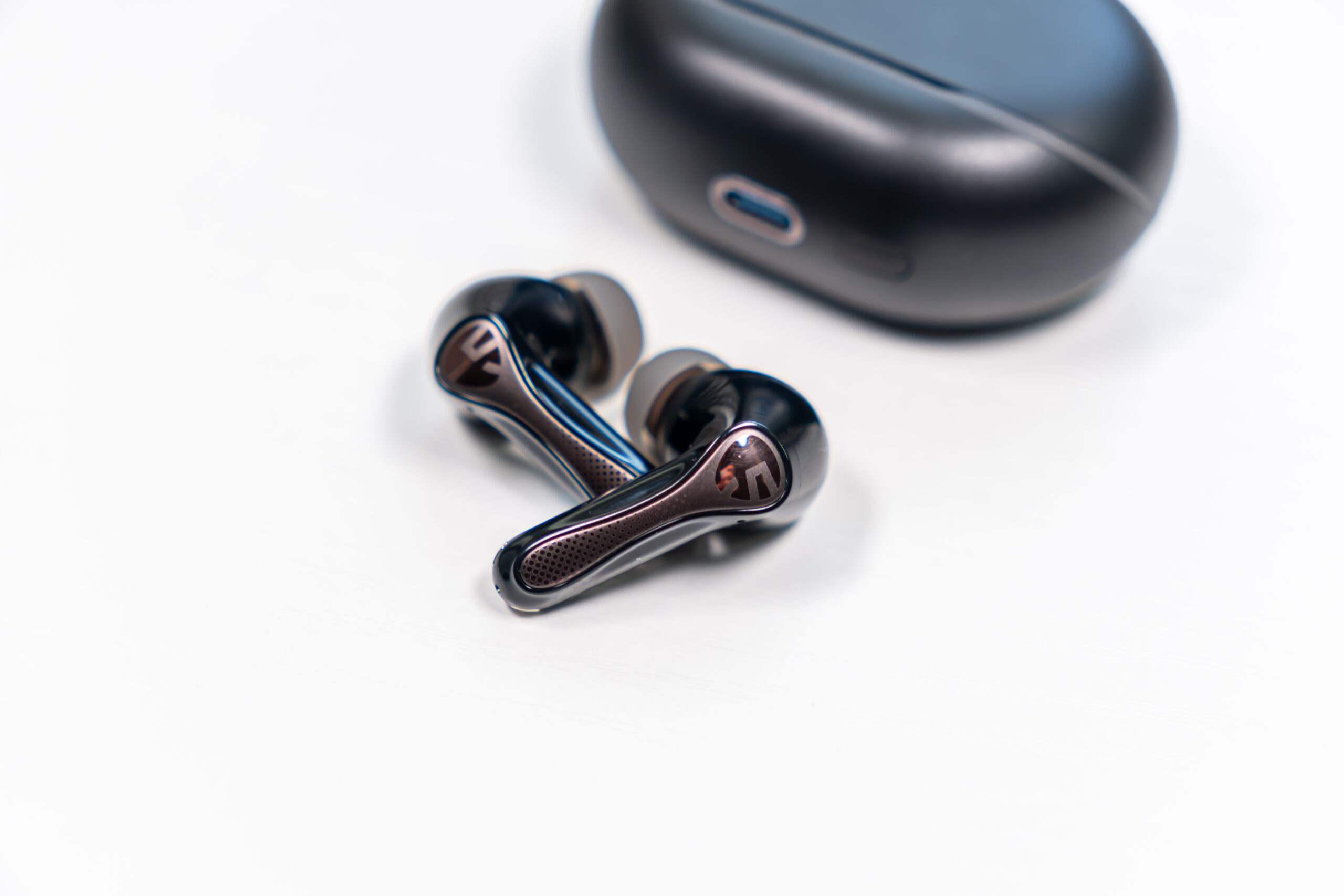 イヤホンはケースと違って光沢のある仕上がり。ステム部分は銅っぽい色味でSOUNDPEATSのロゴマークと細かい模様が施されています。